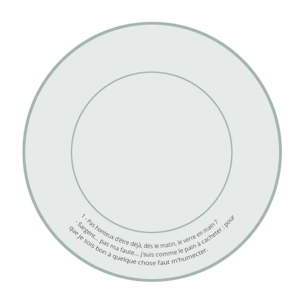 Légende(s) : Le titre de la série est inscrit en lettres capitales d'imprimerie alors que les dialogues de l'assiette sont écrits en lettres minuscules. Les deux légendes suivent la forme arrondie de l’assiette