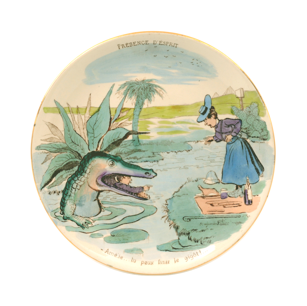 Légende(s) : Le titre de l'assiette est inscrit en lettres capitales d'imprimerie alors que les diaogue sont écrits en lettres minuscules. Les deux inscriptions suivent la forme arrondie de l’assiette