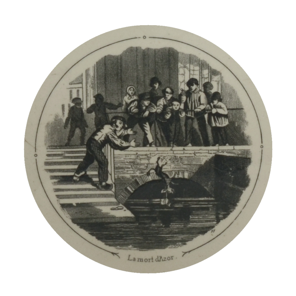 Légende(s) : Le titre de la série est inscrit en lettres gothique dans un écu sur l'aile. Le titre de l'assiette est écrit en lettres minuscules et suit la forme arrondie de l’assiette